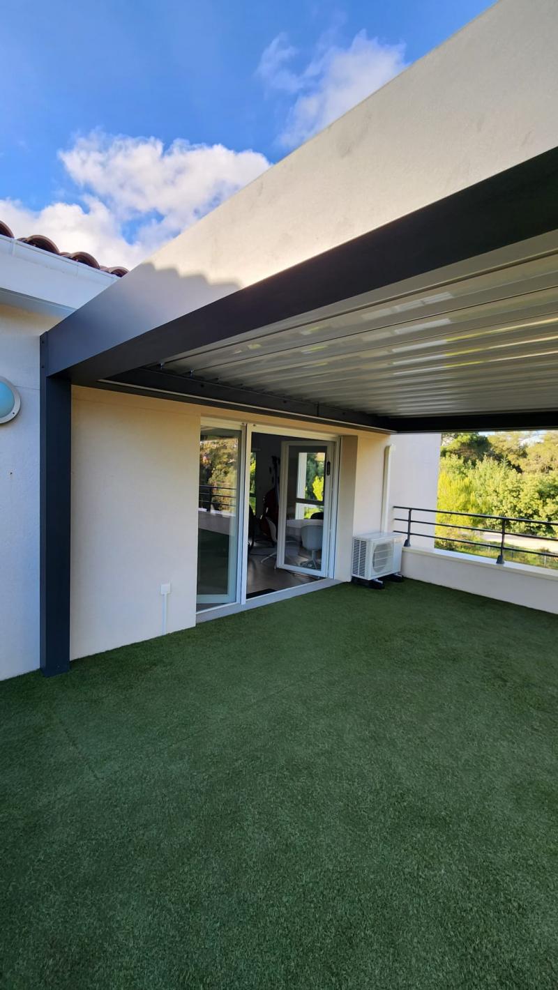 Découvrez cette magnifique réalisation : une pergola bioclimatique parfaitement intégrée à la terrasse, offrant un espace de vie lumineux, moderne et protégé toute l'année.