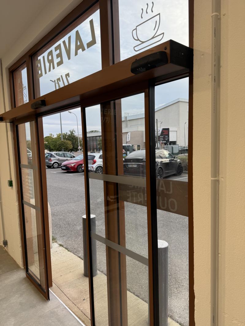 Travail soigné : une ouverture automatique fluide et discrète, pensée pour le confort des clients de la nouvelle laverie.